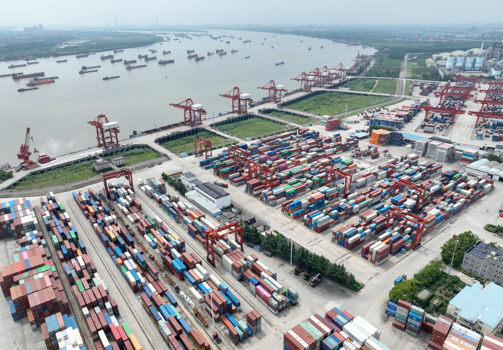 2024年6月1日拍攝的湖北武漢陽(yáng)邏港(無人機(jī)照片)。2013年時(shí),陽(yáng)邏港僅有兩條集裝箱航線,船型小、班期少;如今,陽(yáng)邏港已開通各類集裝箱航線20余條,實(shí)現(xiàn)“航運(yùn)向東入海、班列向西入歐”。