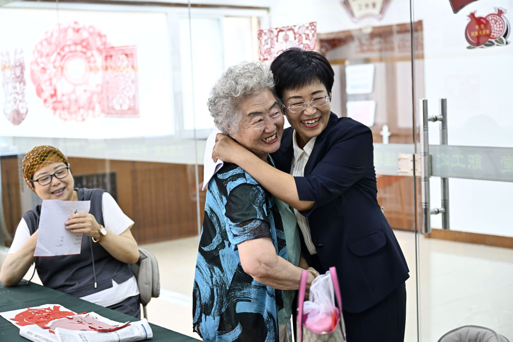 6月20日,寧夏銀川市金鳳區(qū)長(zhǎng)城花園社區(qū)黨委書記趙耐香(右一)在社區(qū)“才藝堂”與居民交流。