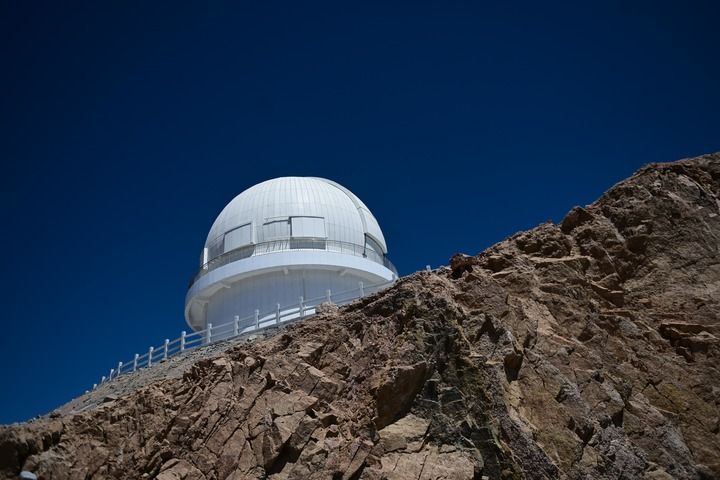 這是在青海省海西蒙古族藏族自治州茫崖市冷湖鎮(zhèn)賽什騰山拍攝的中國科學(xué)技術(shù)大學(xué)和中國科學(xué)院紫金山天文臺(tái)聯(lián)合研制的大視場(chǎng)光學(xué)成像望遠(yuǎn)鏡——墨子巡天望遠(yuǎn)鏡(2024年4月20日攝)。