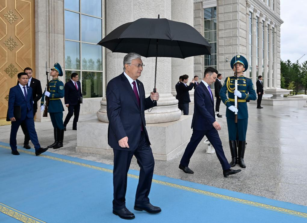 托卡耶夫?yàn)榱?xí)近平舉行隆重歡迎儀式??偨y(tǒng)府大廳氣勢恢宏,禮兵威武挺拔。兩國元首分別同對方陪同人員一一握手致意。兩國元首登上檢閱臺(tái),軍樂團(tuán)奏中哈兩國國歌。習(xí)近平在托卡耶夫陪同下檢閱儀仗隊(duì)。