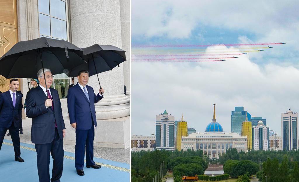 當(dāng)?shù)貢r(shí)間7月3日,國家主席習(xí)近平在阿斯塔納出席哈薩克斯坦總統(tǒng)托卡耶夫舉行的歡迎儀式。習(xí)近平乘車抵達(dá)總統(tǒng)府時(shí),托卡耶夫總統(tǒng)熱情迎接。六架哈薩克斯坦空軍戰(zhàn)機(jī)從總統(tǒng)府上空飛過,拉出象征中國國旗的紅黃色彩煙,以最高禮儀歡迎習(xí)近平對哈薩克斯坦進(jìn)行國事訪問。