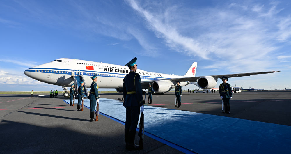 習近平專機起飛后,哈薩克斯坦三架空軍戰(zhàn)機升空護航。