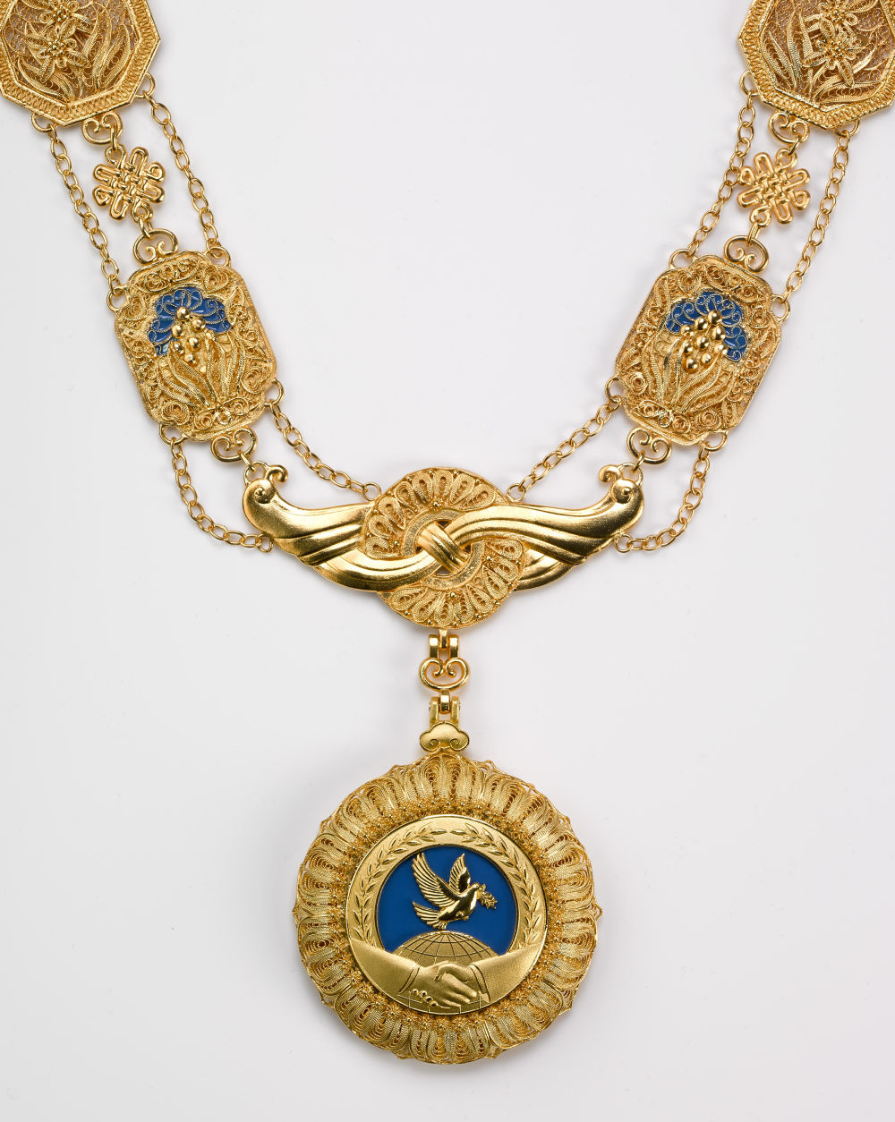 “友誼勛章”章體以金色、藍色為主色調(diào),采用和平鴿、地球、握手、荷花等元素,章鏈采用中國結(jié)、萬年青、牡丹花、玉璧、蘭草等元素,整體采用花絲鑲嵌、掐絲琺瑯等傳統(tǒng)工藝手工制作。設(shè)計制作象征中國人民同各國人民友好團結(jié)、友誼長存,祝愿世界各國共同繁榮發(fā)展。