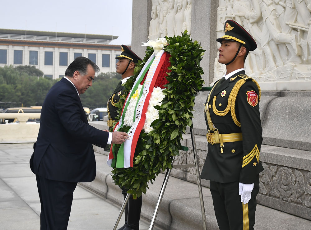 2017年8月31日,塔吉克斯坦總統(tǒng)拉赫蒙前往北京天安門廣場,向人民英雄紀(jì)念碑敬獻花圈。