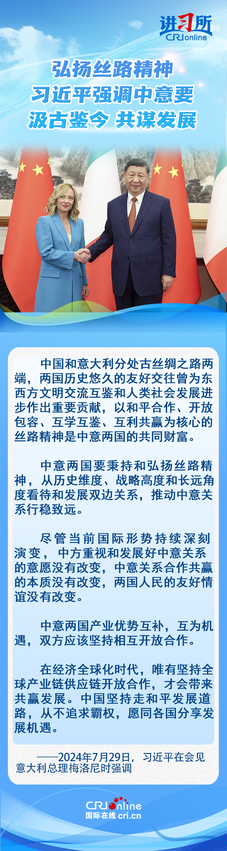 7月29日,中國國家主席習近平在北京會見來華進行正式訪問的意大利總理梅洛尼。習近平指出,今年是中意建立全面戰(zhàn)略伙伴關(guān)系20周年和馬可·波羅逝世700周年,雙方汲古鑒今、共謀發(fā)展面臨重要機遇。