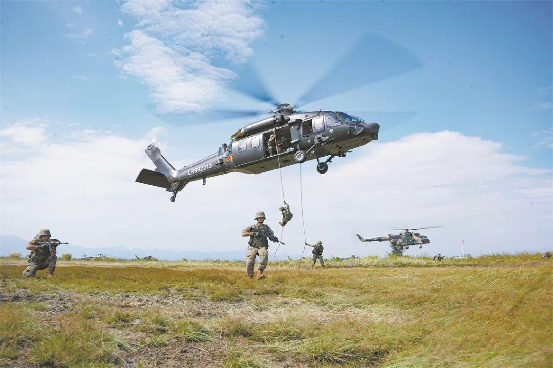 第72集團(tuán)軍某旅某合成營(yíng)官兵在陸航部隊(duì)配合下開(kāi)展機(jī)降訓(xùn)練。