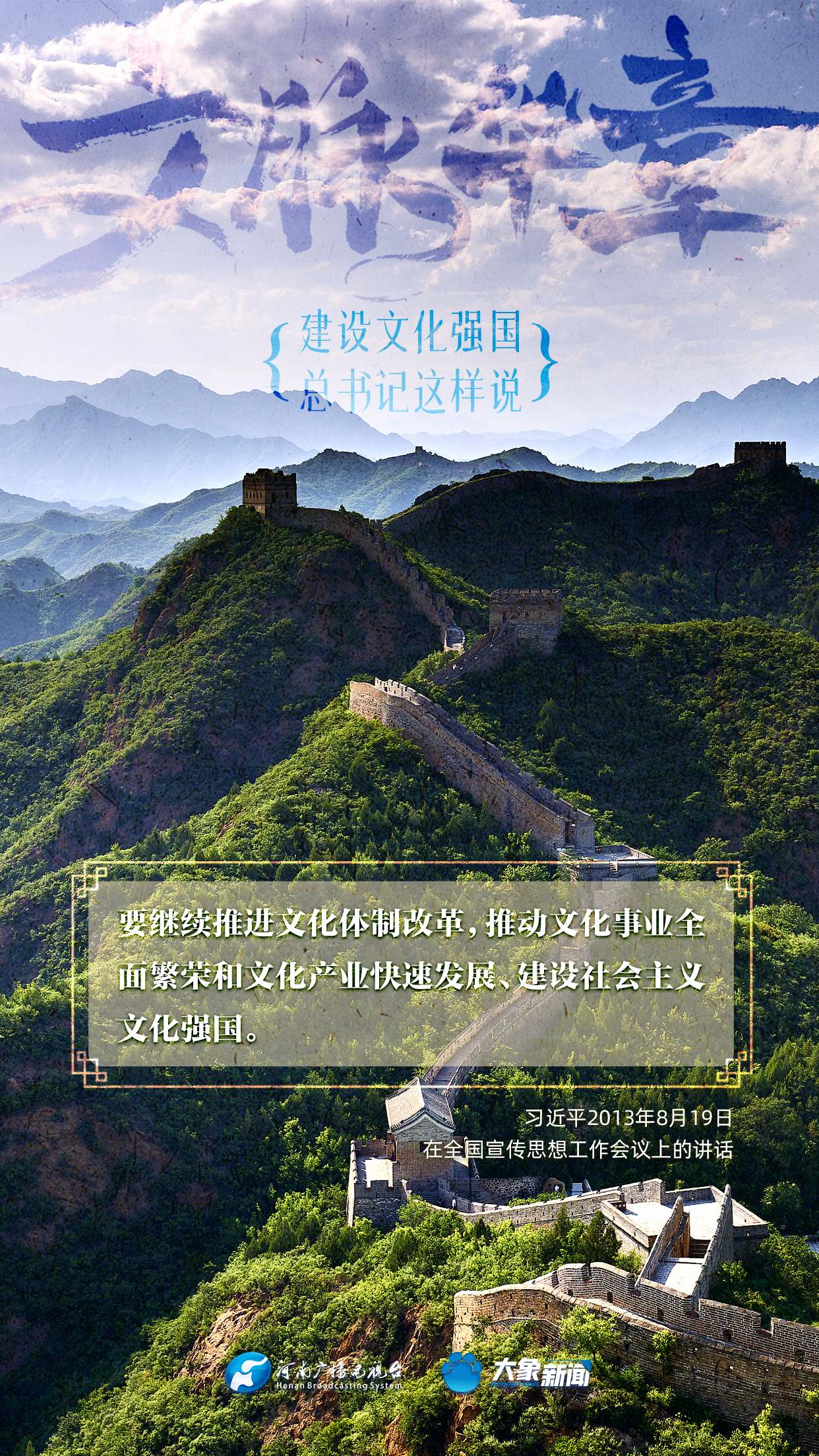 黨的十八大以來,習近平總書記站在全局和戰(zhàn)略高度,就建設(shè)社會主義文化強國提出一系列新思想新觀點新論斷,為我們堅定文化自信,堅持中國特色社會主義文化發(fā)展道路,提供了指引。大象新聞與您一起學習、領(lǐng)悟。