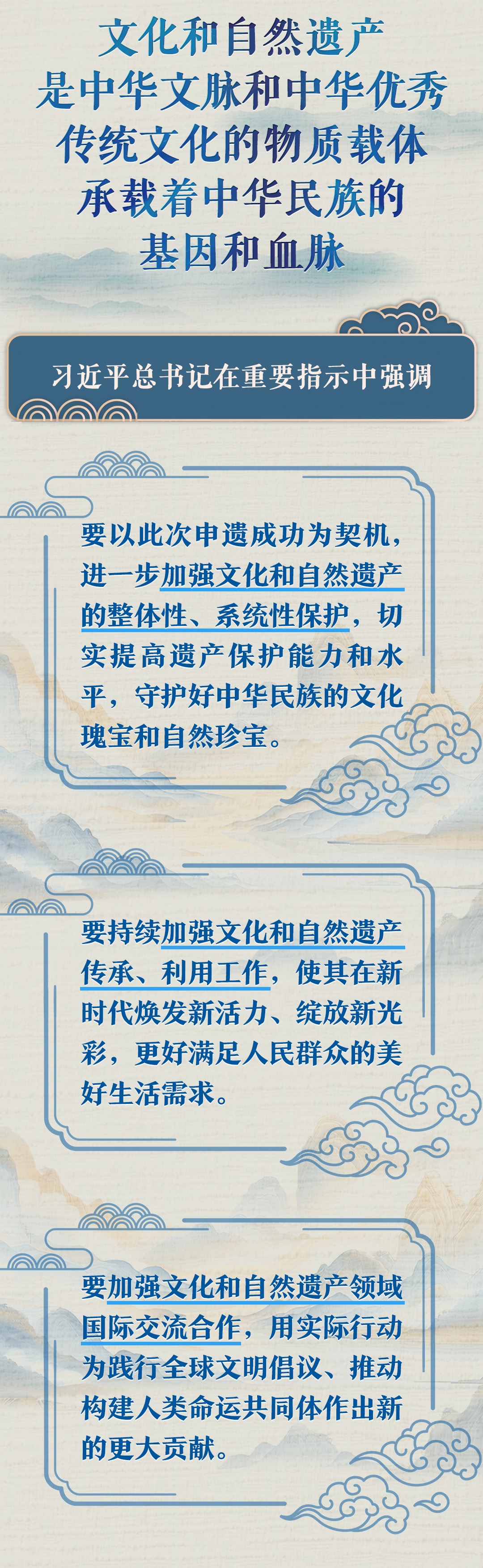 文化遺產(chǎn)體現(xiàn)了中華民族旺盛的生命力和創(chuàng)造力,自然遺產(chǎn)昭示了神奇的自然造化同中華民族的和諧依存關(guān)系。習近平總書記一直以來高度重視文化和自然遺產(chǎn)保護傳承利用工作,近日專門就此作出重要指示強調(diào),守護好中華民族的文化瑰寶和自然珍寶,讓文化和自然遺產(chǎn)在新時代煥發(fā)新活力綻放新光彩。讓我們一同學習。