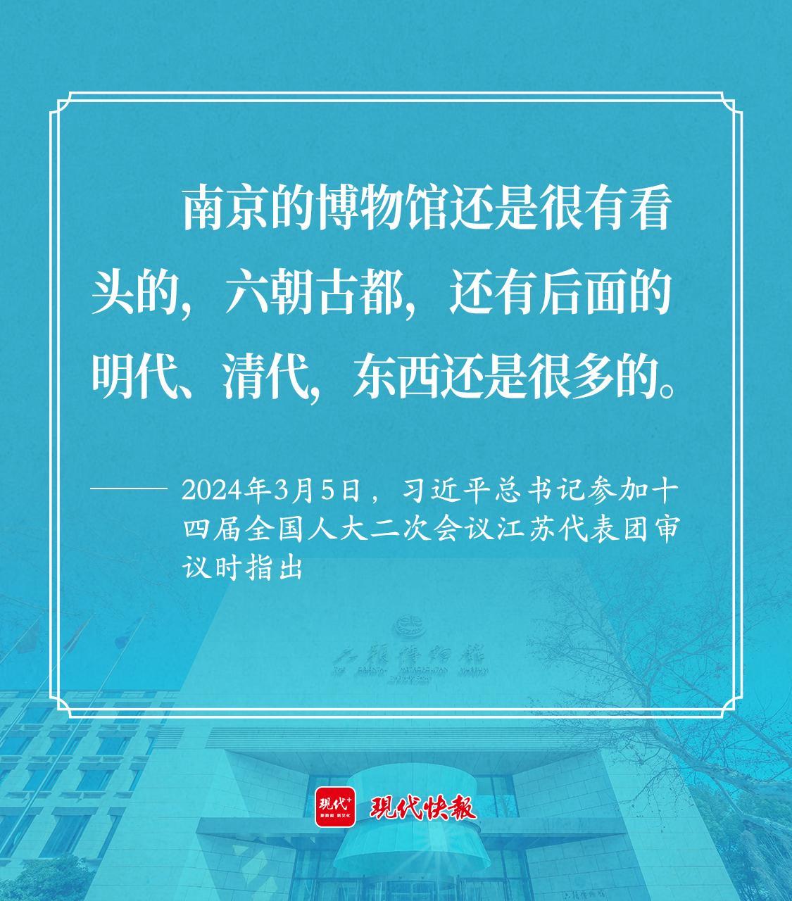 2024年3月5日,習(xí)近平總書(shū)記參加十四屆全國(guó)人大二次會(huì)議江蘇代表團(tuán)審議??倳?shū)記在聽(tīng)完南京市博物總館副館長(zhǎng)宋燕代表講述后表示,“南京的博物館還是很有看頭的,六朝古都,還有后面的明代、清代,東西還是很多的?!?/p>