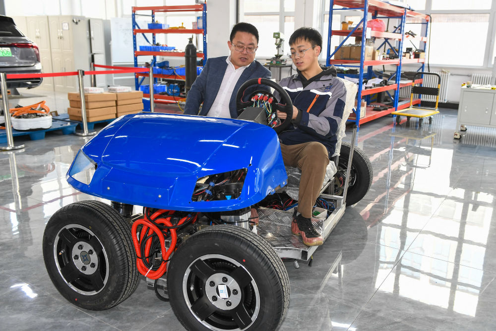 2024年3月13日,在吉林長春一家汽車科技企業(yè),吉林大學汽車工程學院教授靳立強(左)試乘智能底盤樣車。2023年,長春市科技局和吉林大學共建吉林大學概念驗證中心,一手對接高校,一手對接企業(yè),確??蒲谐晒诩夹g路線和商業(yè)模式上的可行性,實現(xiàn)“從0到1”的轉化。