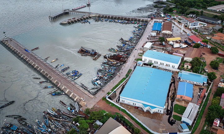 這是2024年7月8日在幾內(nèi)亞比紹首都比紹拍攝的板丁漁業(yè)碼頭和中企投建的水產(chǎn)品加工存儲綜合設施(右側(cè)藍頂建筑區(qū)域)(無人機照片)。新華社記者 韓旭 攝