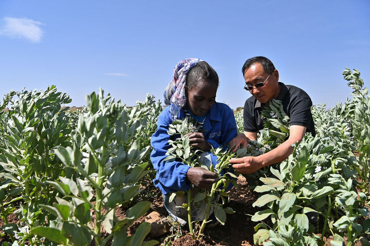 2023年9月27日,在位于厄立特里亞阿斯馬拉的農(nóng)業(yè)技術(shù)援助項目示范地,中國援厄第三期高級農(nóng)業(yè)專家組豆類作物專家劉運民(右)指導當?shù)剞r(nóng)戶進行蠶豆作物的田間管理。新華社記者 韓旭 攝