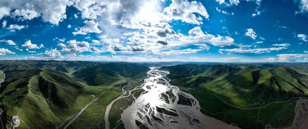 2024年7月31日在青海省果洛藏族自治州達(dá)日縣境內(nèi)拍攝的黃河(無人機(jī)全景照片)。