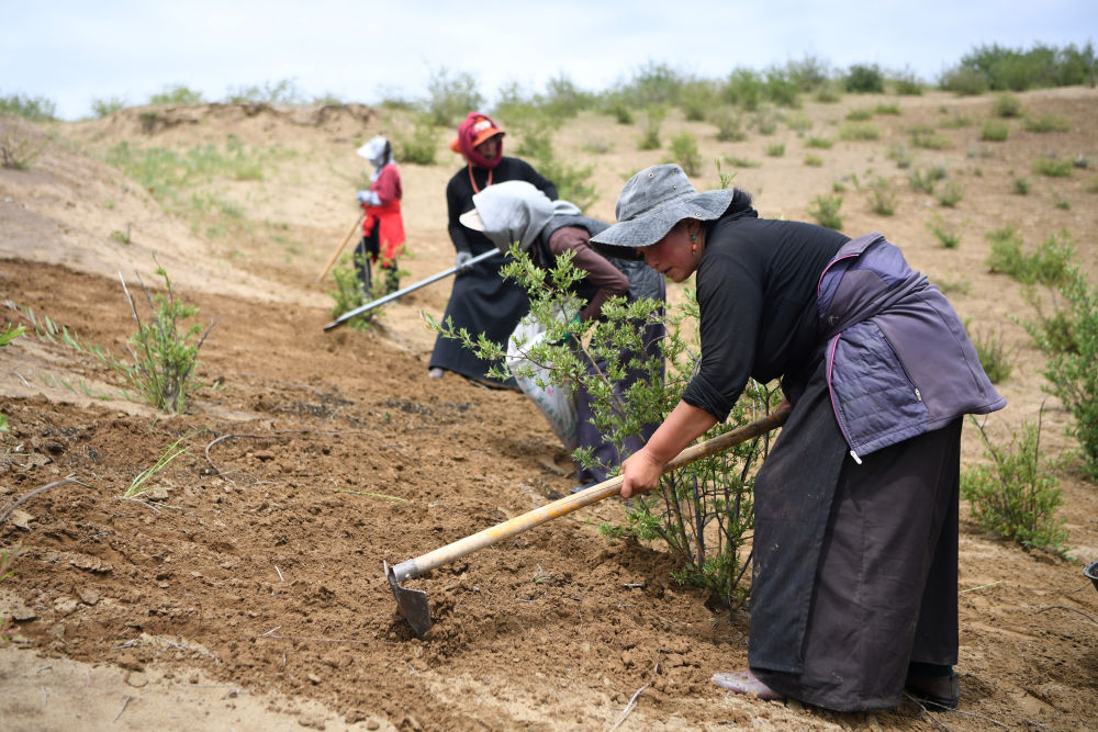 2023年7月6日,牧民在甘肅省甘南藏族自治州瑪曲縣歐拉鎮(zhèn)黃河沿岸一處沙化草原治理點(diǎn)補(bǔ)種草籽。