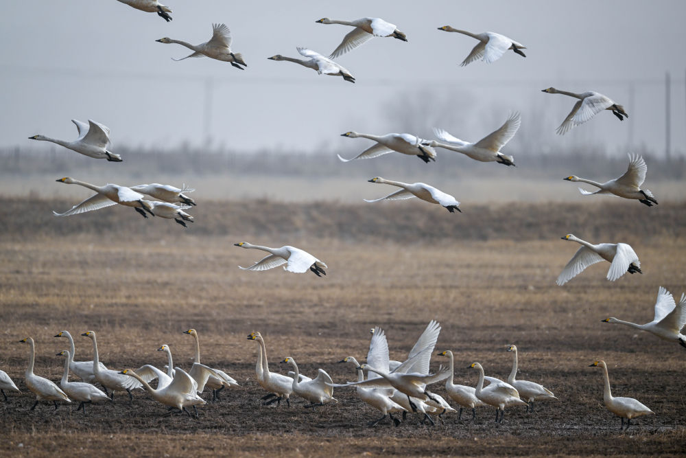 2024年3月16日在內(nèi)蒙古呼和浩特市托克托縣黃河濕地拍攝的天鵝。隨著當(dāng)?shù)厣鷳B(tài)環(huán)境持續(xù)改善,候鳥數(shù)量連年增加。