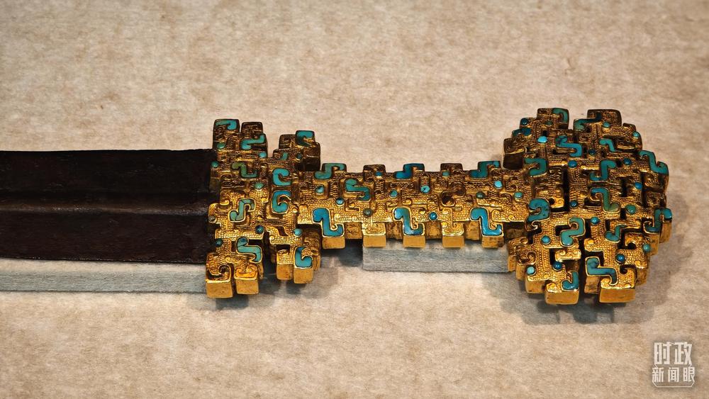△這是1992年寶雞市益門二號墓出土的金柄鐵劍,劍柄嵌有綠松石。(總臺央視記者彭漢明拍攝)