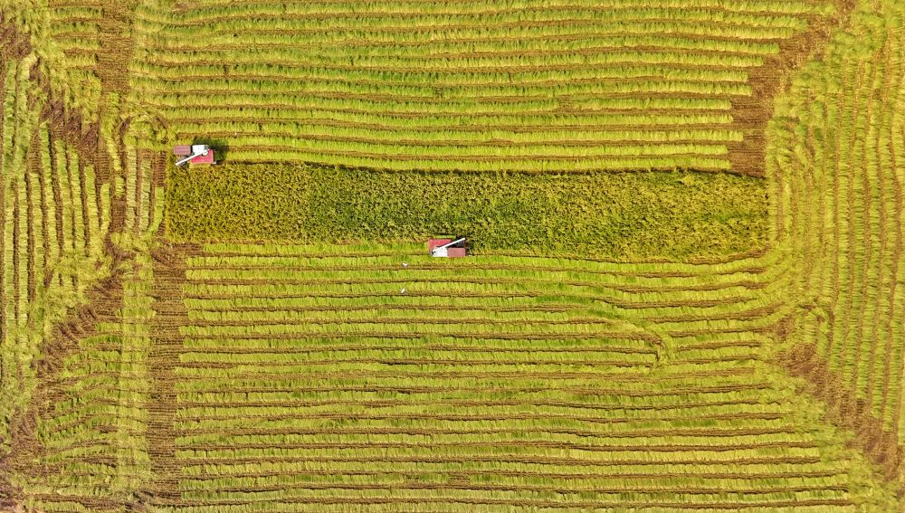 2024年8月22日,收割機(jī)在永豐村高標(biāo)準(zhǔn)農(nóng)田內(nèi)收割水稻(無人機(jī)照片)。團(tuán)隊(duì)預(yù)計,2024年永豐村高標(biāo)準(zhǔn)農(nóng)田平均畝產(chǎn)將接近800公斤。