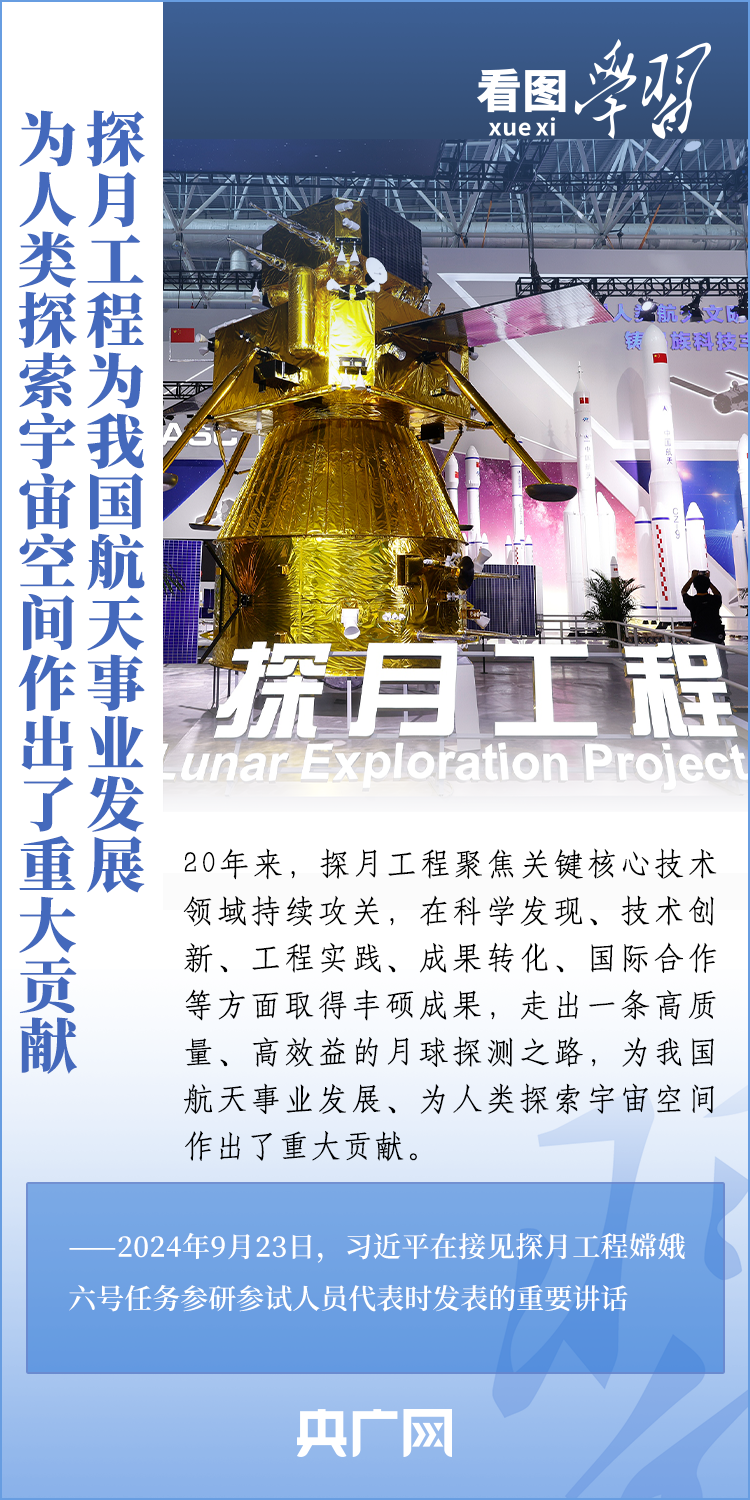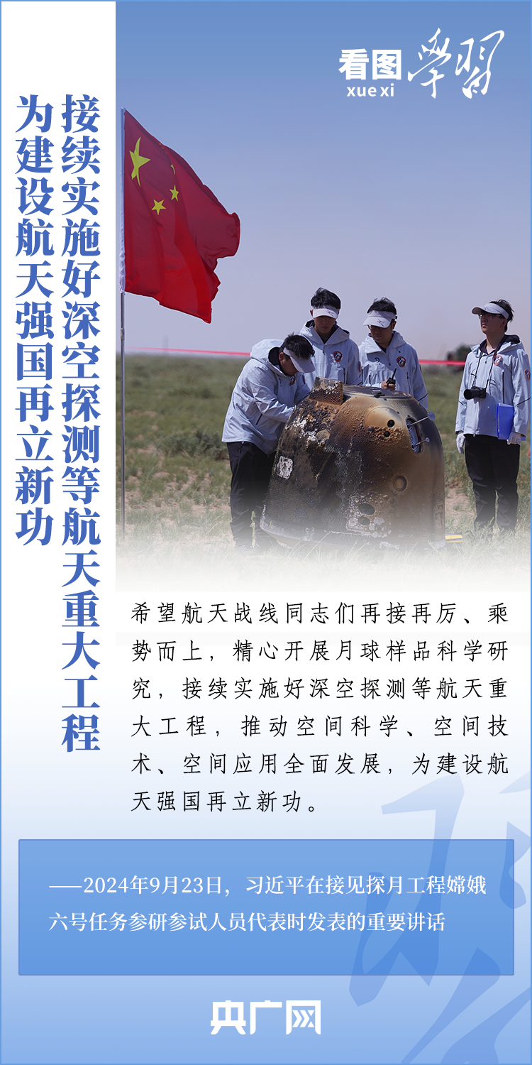 中國探月工程成果凝結(jié)著我國幾代航天人的智慧和心血。9月23日,習(xí)近平總書記接見探月工程嫦娥六號任務(wù)參研參試人員代表并發(fā)表重要講話??倳浉叨瓤隙ㄦ隙鹆柸蝿?wù)成功的重要意義,以及探月工程為我國航天事業(yè)發(fā)展、為人類探索宇宙空間作出的重大貢獻(xiàn),勉勵航天戰(zhàn)線工作者再接再厲、乘勢而上,為建設(shè)航天強國再立新功。一起來學(xué)習(xí)!