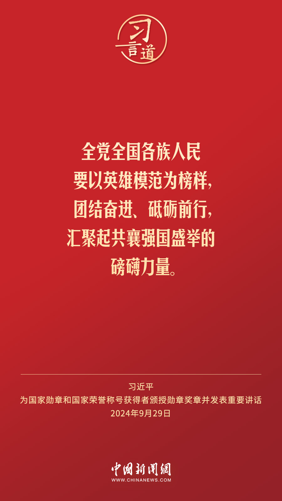 經(jīng)中共中央批準(zhǔn),中華人民共和國國家勛章和國家榮譽稱號頒授儀式于9月29日上午10時在人民大會堂隆重舉行。中共中央總書記、國家主席、中央軍委主席習(xí)近平向國家勛章和國家榮譽稱號獲得者分別授予“共和國勛章”“友誼勛章”和國家榮譽稱號獎?wù)虏l(fā)表重要講話。習(xí)近平指出——