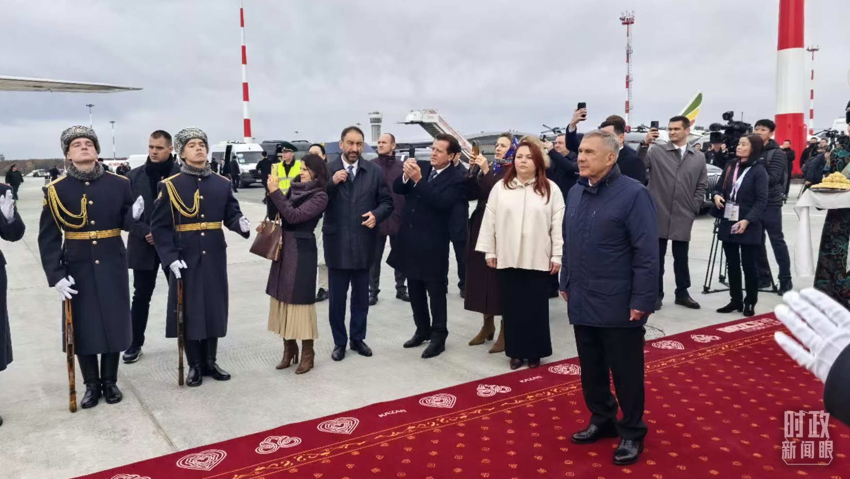 習(xí)主席專機(jī)抵達(dá)喀山國際機(jī)場(chǎng)時(shí),俄羅斯聯(lián)邦韃靼斯坦共和國行政長(zhǎng)官等在機(jī)場(chǎng)熱情迎接。(總臺(tái)央視記者王鵬飛拍攝)