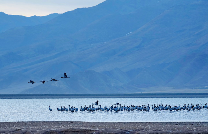 在雅魯藏布江中游河谷黑頸鶴國家級自然保護區(qū),黑頸鶴飛翔在一片水域上空(2024年3月17日攝)。多年來,西藏各級黨委政府和對口援藏省市接續(xù)投入2.4億余元資金開展生態(tài)建設(shè),創(chuàng)設(shè)的雅江北岸南木林生態(tài)示范區(qū)已完成造林4萬多畝,昔日戈壁荒灘漸變江畔綠洲,也成了黑頸鶴越冬的理想棲息地。監(jiān)測數(shù)據(jù)顯示,西藏境內(nèi)的黑頸鶴種群數(shù)量持續(xù)增長,已由上世紀的不足3000只增長到目前的1萬余只。