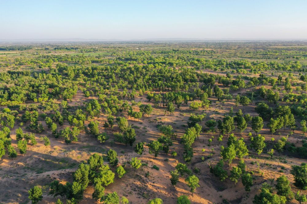 2023年6月14日在內(nèi)蒙古毛烏素沙地拍攝的當?shù)啬撩穹N植的一片樹林(無人機照片)。2024年以來,內(nèi)蒙古全面開展“三北”工程攻堅戰(zhàn),已完成防沙治沙面積約1954萬畝,約為年度總?cè)蝿?wù)1730萬畝的113%,超額完成年度任務(wù)。