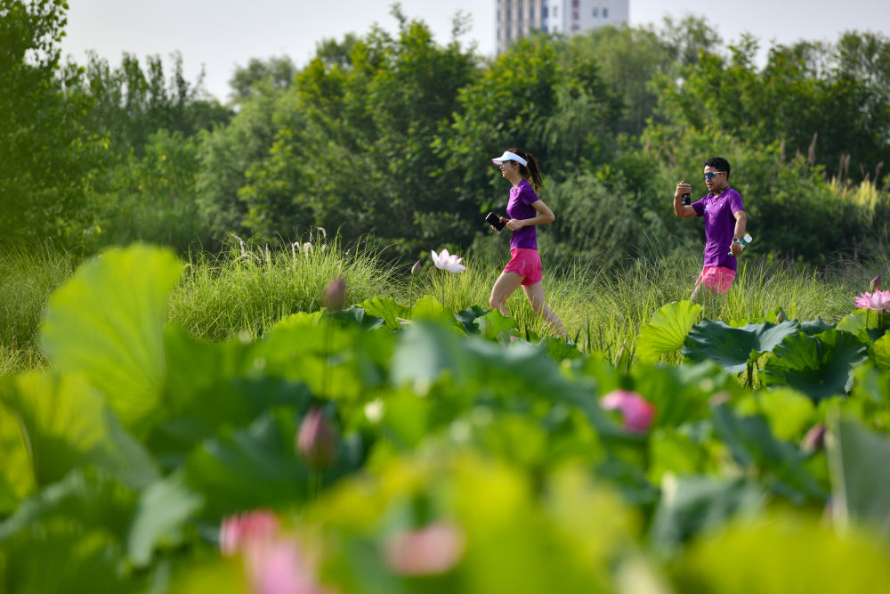 2024年6月23日,市民在陜西省漢中市天漢濕地公園內(nèi)運動休閑。漢江是長江的最大支流,是南水北調(diào)中線工程的重要水源。近年來,漢中市加強對漢江源頭和沿岸濕地生態(tài)保護修復(fù),構(gòu)建人水和諧共生的美麗城市,確?!耙汇逅览m(xù)北上”。