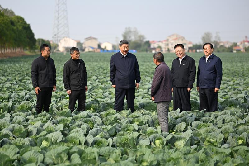 2024年11月5日,習近平總書記在湖北省咸寧市嘉魚縣潘家灣鎮(zhèn)十里蔬菜長廊考察時,同菜農親切交流。