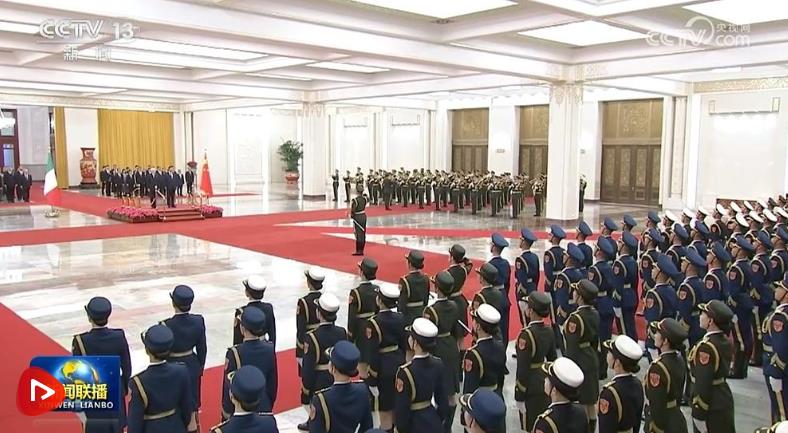 天安門廣場鳴放21響禮炮,禮兵列隊(duì)致敬。兩國元首登上檢閱臺(tái),軍樂團(tuán)奏中意兩國國歌。馬塔雷拉在習(xí)近平陪同下檢閱中國人民解放軍儀仗隊(duì),并觀看分列式。