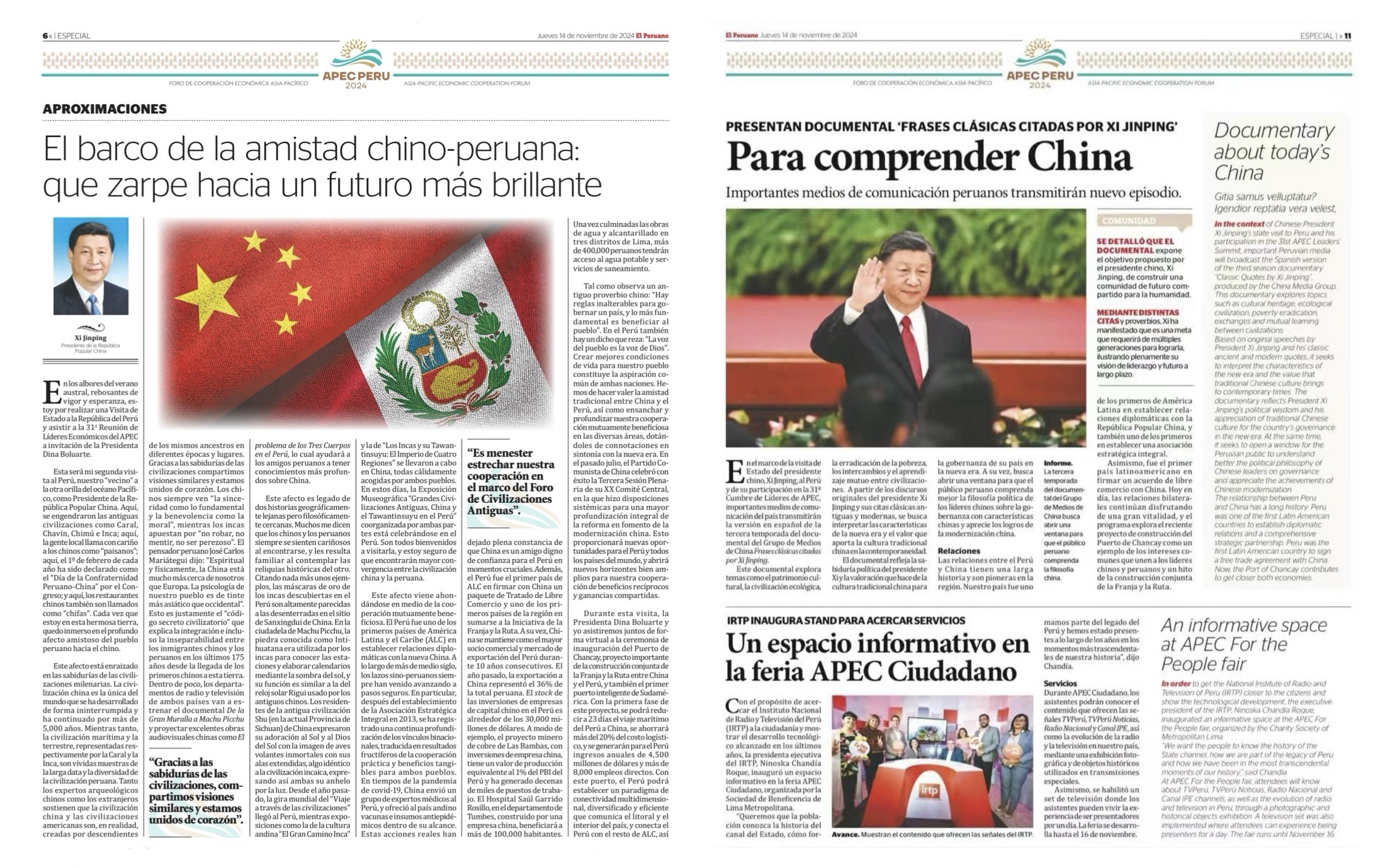 在中國國家主席習近平應秘魯共和國總統(tǒng)博魯阿爾特邀請,赴利馬出席亞太經合組織第三十一次領導人非正式會議并對秘魯進行國事訪問之際,由中國中央廣播電視總臺制作的《平“語”近人——習近平喜歡的典故》第三季(西班牙語版),將于當?shù)貢r間11月14日起在秘魯國家廣播電視臺、秘魯電視聯(lián)播網(wǎng)、秘魯廣播節(jié)目集團電視端等多平臺落地播出。當?shù)囟嗉抑髁髅襟w對節(jié)目落播進行預告,引發(fā)秘魯各界普遍期待和廣泛關注。