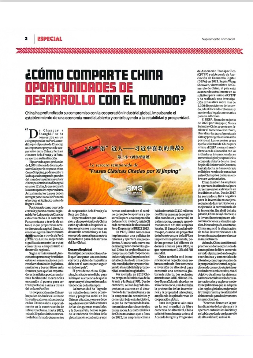 11月14日,秘魯最具影響力的官方報紙《秘魯人報》刊發(fā)節(jié)目在秘魯落播的消息。文章指出,《平“語”近人——習近平喜歡的典故》第三季展現(xiàn)了中華民族開放包容、兼收并蓄的文化胸懷,闡釋了習近平主席提出的推動構建人類命運共同體的這一重大理念,是對“建設一個什么樣的世界、怎樣建設這個世界”給出的中國方案。《秘魯人報》特刊整版刊發(fā)《平“語”近人——習近平喜歡的典故》第三季(西班牙語版)將在秘魯主流媒體落播特稿?!睹佤斎藞蟆饭倬W(wǎng)也同步刊發(fā)了節(jié)目預告消息和海報。
