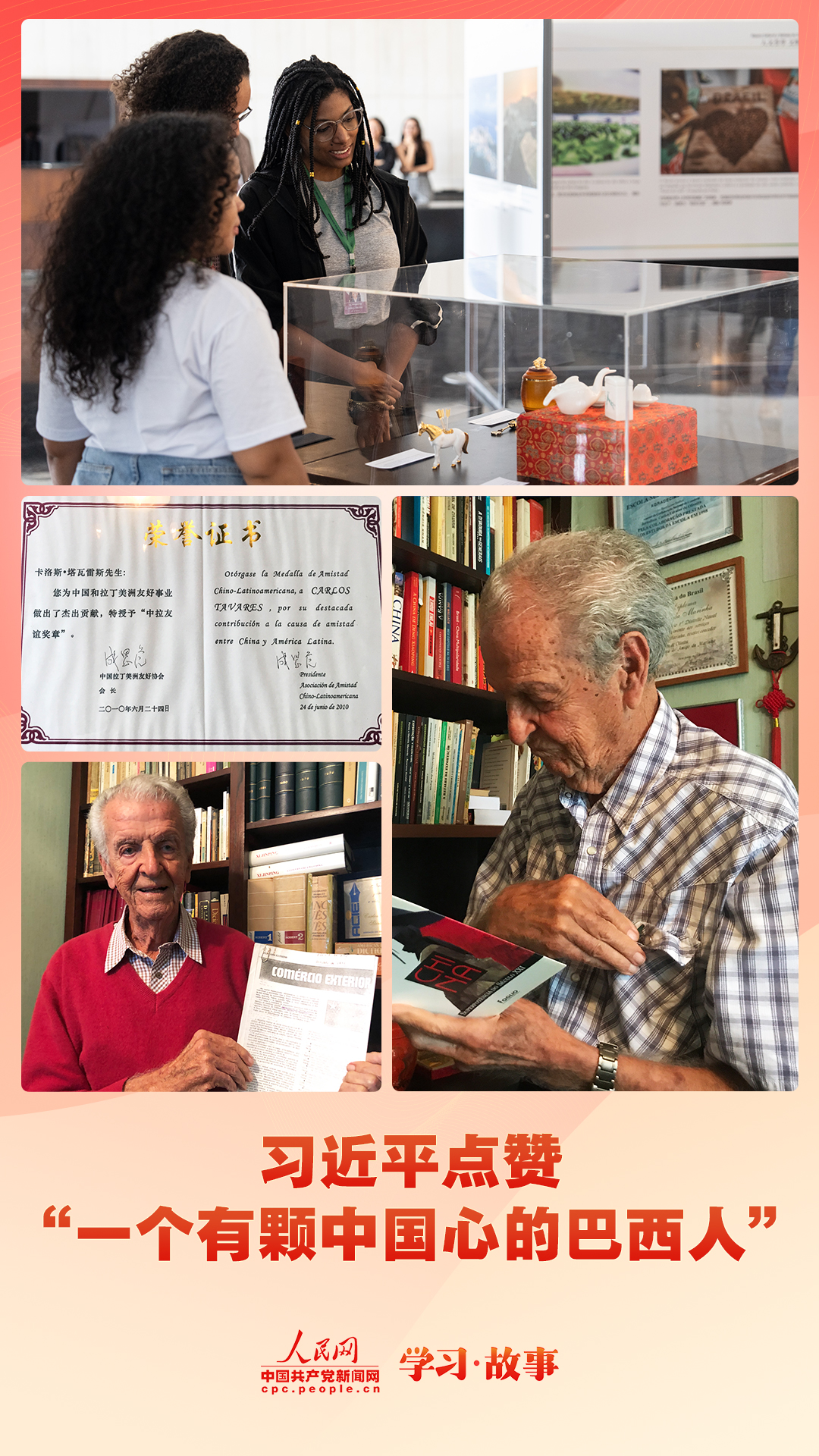 1990年,卡洛斯·塔瓦雷斯受邀來(lái)到中國(guó)?;氐桨臀骱?,他連續(xù)發(fā)表10篇介紹中國(guó)的文章,在整個(gè)拉美地區(qū)引起震動(dòng)。這些文章匯集成冊(cè),成為卡洛斯·塔瓦雷斯撰寫的第一本關(guān)于中國(guó)的書籍——《中國(guó)的覺(jué)醒》。此后,這位巴西老人在有生之年始終傾心關(guān)注和研究中國(guó),其間寫下了有關(guān)中國(guó)的10本書和1000余篇文章。