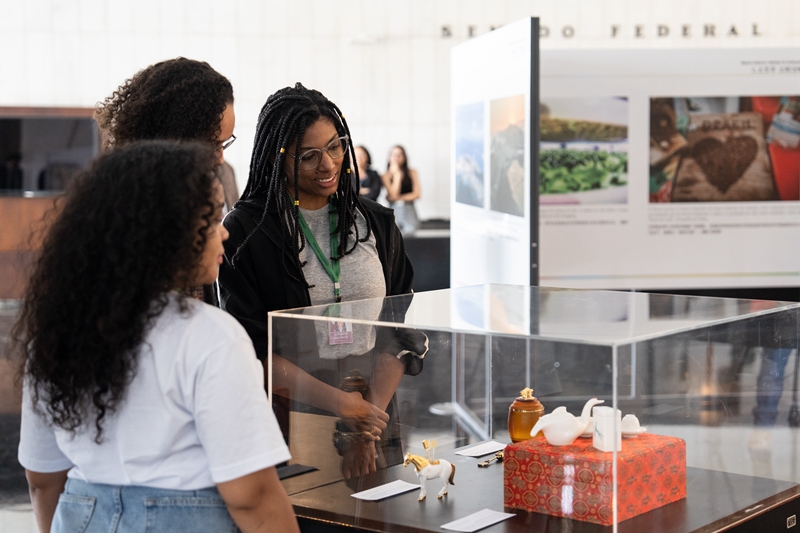 2024年8月15日,在巴西首都巴西利亞舉行的“紐帶:美麗的巴西,美麗的中國(guó)”展覽上,參觀者欣賞中國(guó)工藝品。新華社記者 王天聰攝