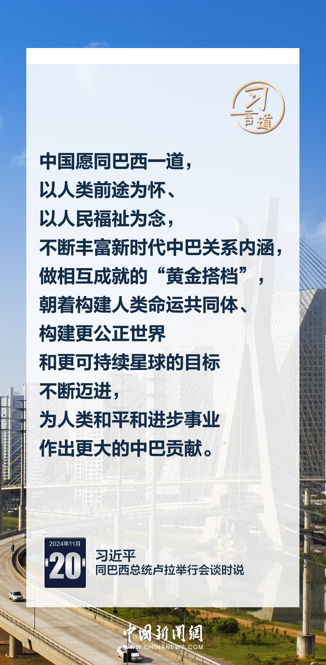當?shù)貢r間11月20日,中國國家主席習近平在巴西利亞總統(tǒng)官邸同巴西總統(tǒng)盧拉舉行會談。習近平指出——