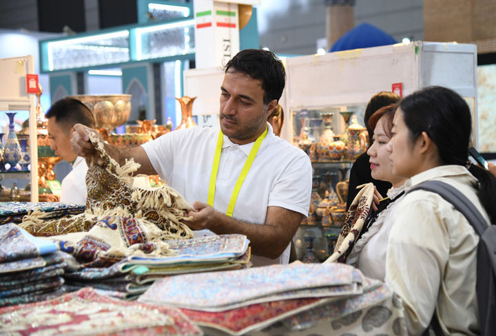 2024年9月20日,在陜西省西安市舉行的第八屆絲綢之路國際博覽會(huì)上,來自伊朗的參展商(前左一)向觀眾介紹產(chǎn)品。 新華社記者 張博文 攝