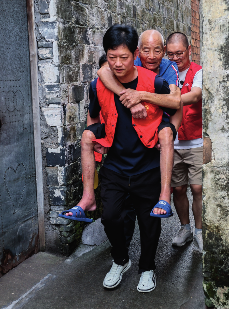 浙江省諸暨市趙家鎮(zhèn)泉畈村村干部和黨員志愿者在臺風(fēng)來臨前轉(zhuǎn)移危舊房里的老人(2024年9月19日攝)徐昱 攝