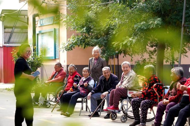 2024年10月8日,在河北巨鹿縣南大韓村菘樂醫(yī)養(yǎng)中心,工作人員陪同老人散心。