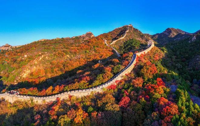 深秋的北京八達(dá)嶺長(zhǎng)城層林盡染,風(fēng)景如畫。