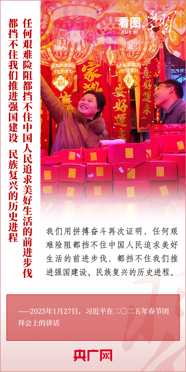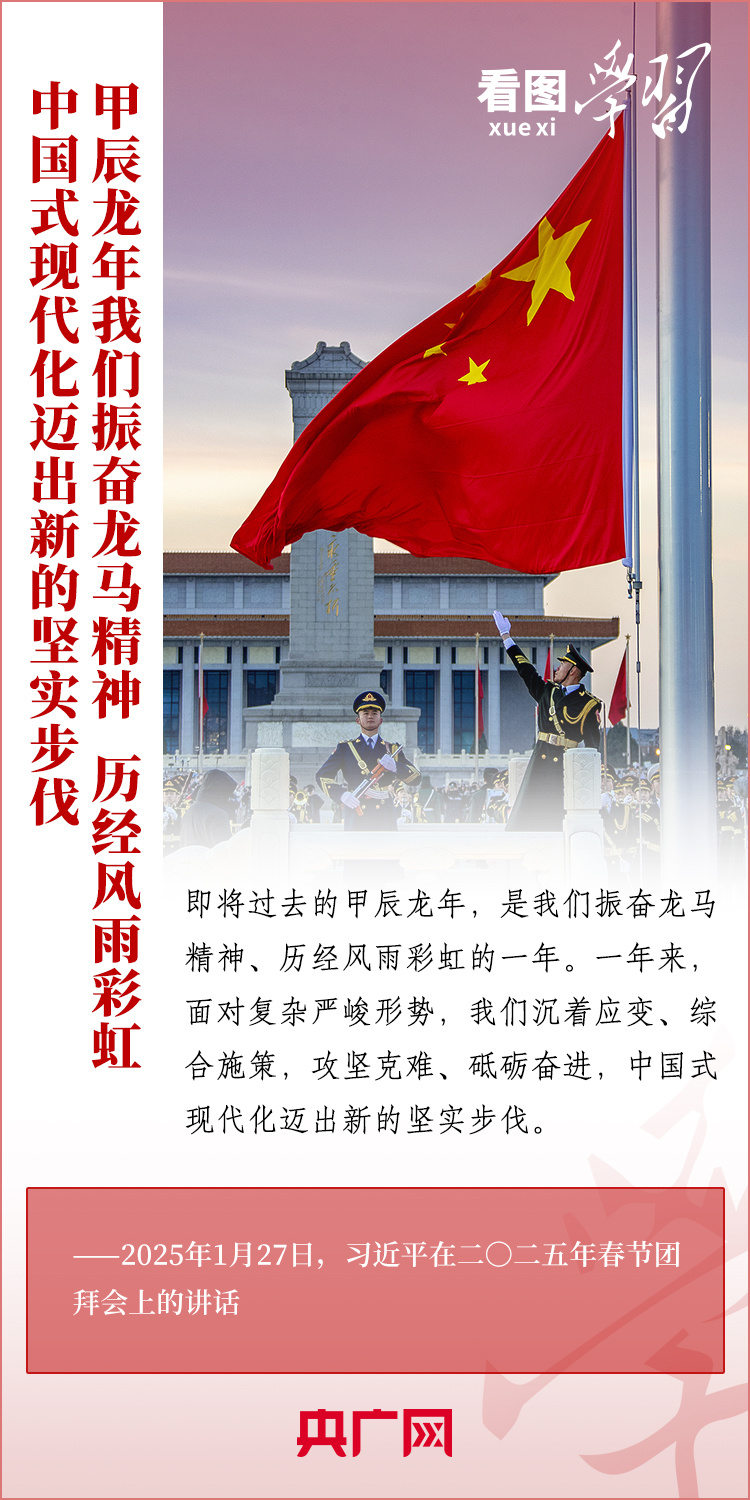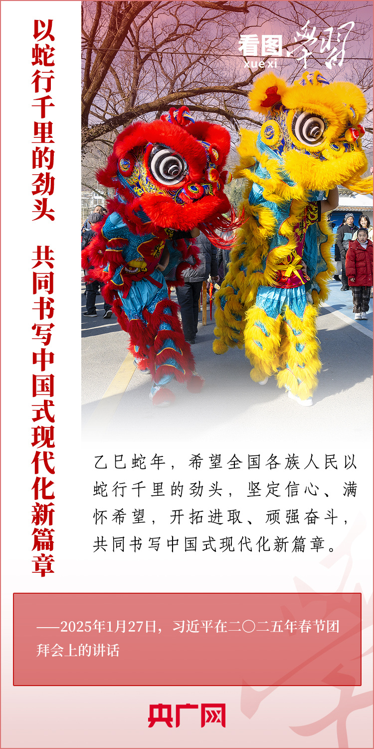 1月27日,中共中央、國(guó)務(wù)院在北京舉行春節(jié)團(tuán)拜會(huì),習(xí)近平總書記發(fā)表熱情洋溢的講話,向全國(guó)各族人民、港澳臺(tái)同胞、海外僑胞拜年并致以新春祝福。總書記在講話中深情回顧過去一年中國(guó)式現(xiàn)代化取得很不平凡的發(fā)展歷程,“希望全國(guó)各族人民以蛇行千里的勁頭,堅(jiān)定信心、滿懷希望,開拓進(jìn)取、頑強(qiáng)奮斗,共同書寫中國(guó)式現(xiàn)代化新篇章?!币黄饋韺W(xué)習(xí)!