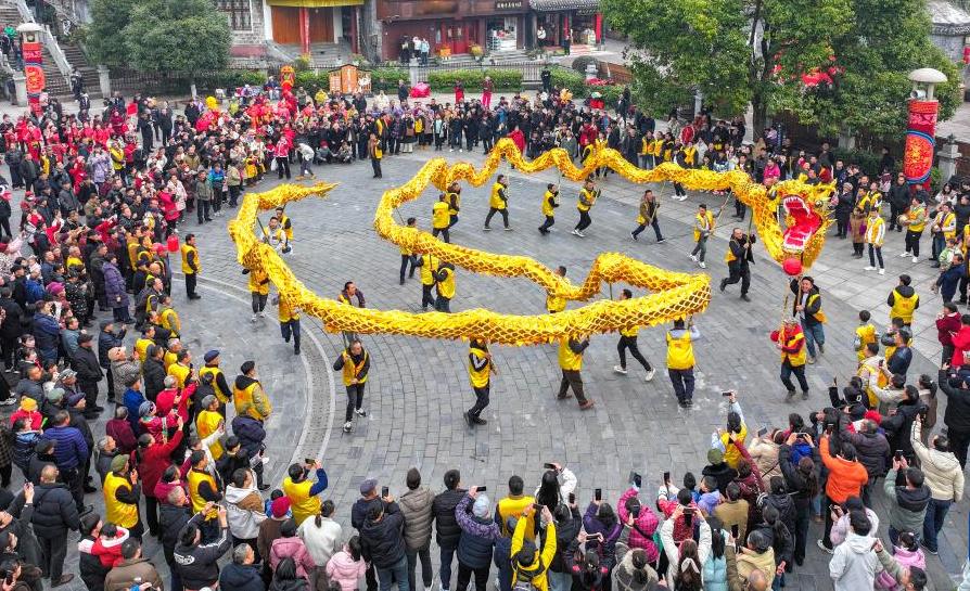 △1月29日,在湖南湘西土家族苗族自治州鳳凰縣文化廣場(chǎng),群眾舞龍歡慶新年。