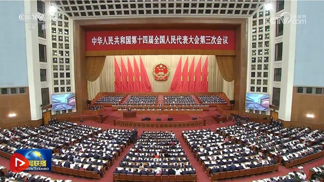 上午9時,趙樂際宣布:中華人民共和國第十四屆全國人民代表大會第三次會議開幕。會場全體起立,高唱國歌。