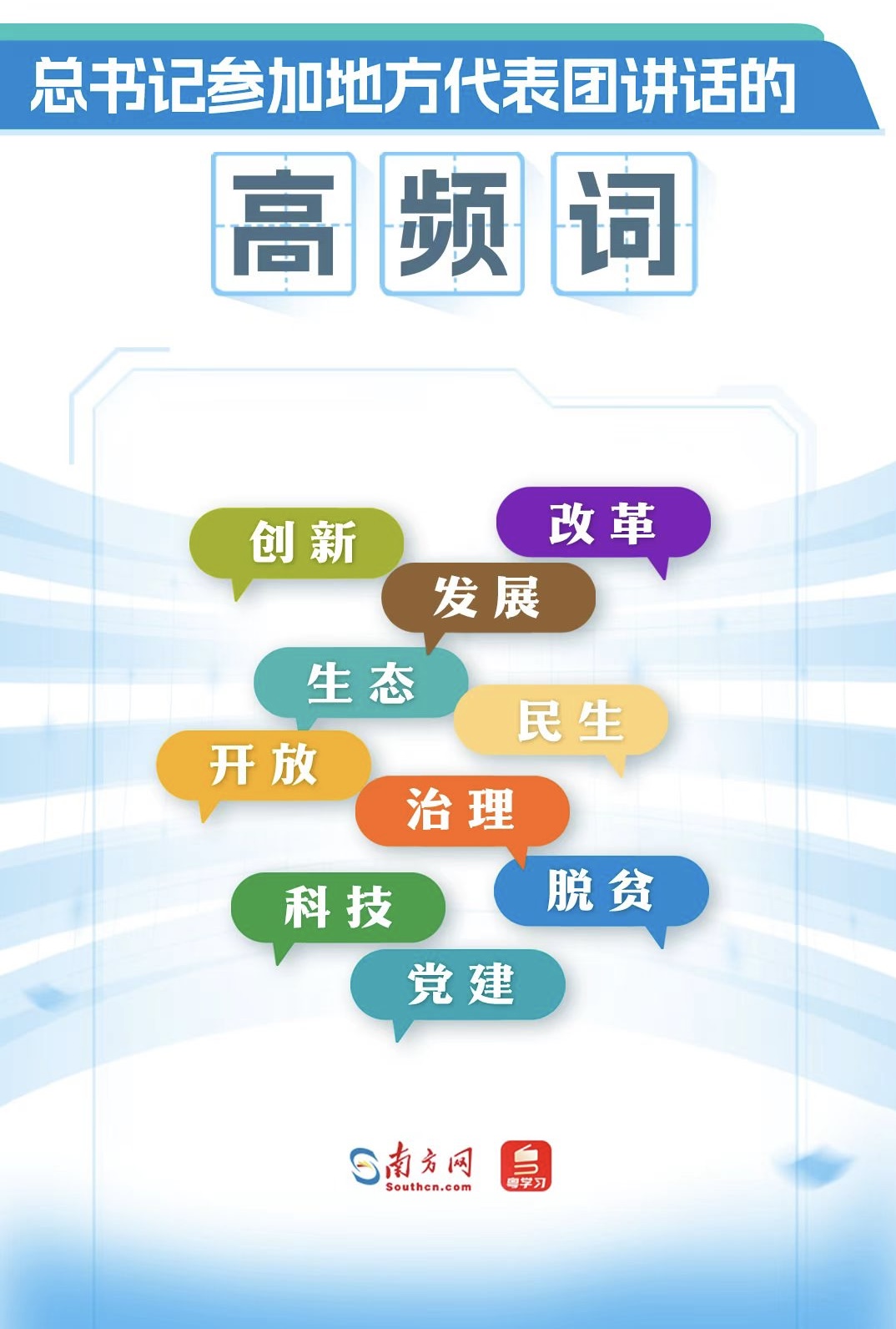13年36次參加地方代表團(tuán)審議,習(xí)近平總書記的講話里,有哪些高頻詞?從詞云圖中,“創(chuàng)新”“改革”“發(fā)展”“生態(tài)”“民生”“開(kāi)放”“治理”“脫貧”“科技”“黨建”等詞語(yǔ)引人注目,反映了總書記的關(guān)注點(diǎn)。