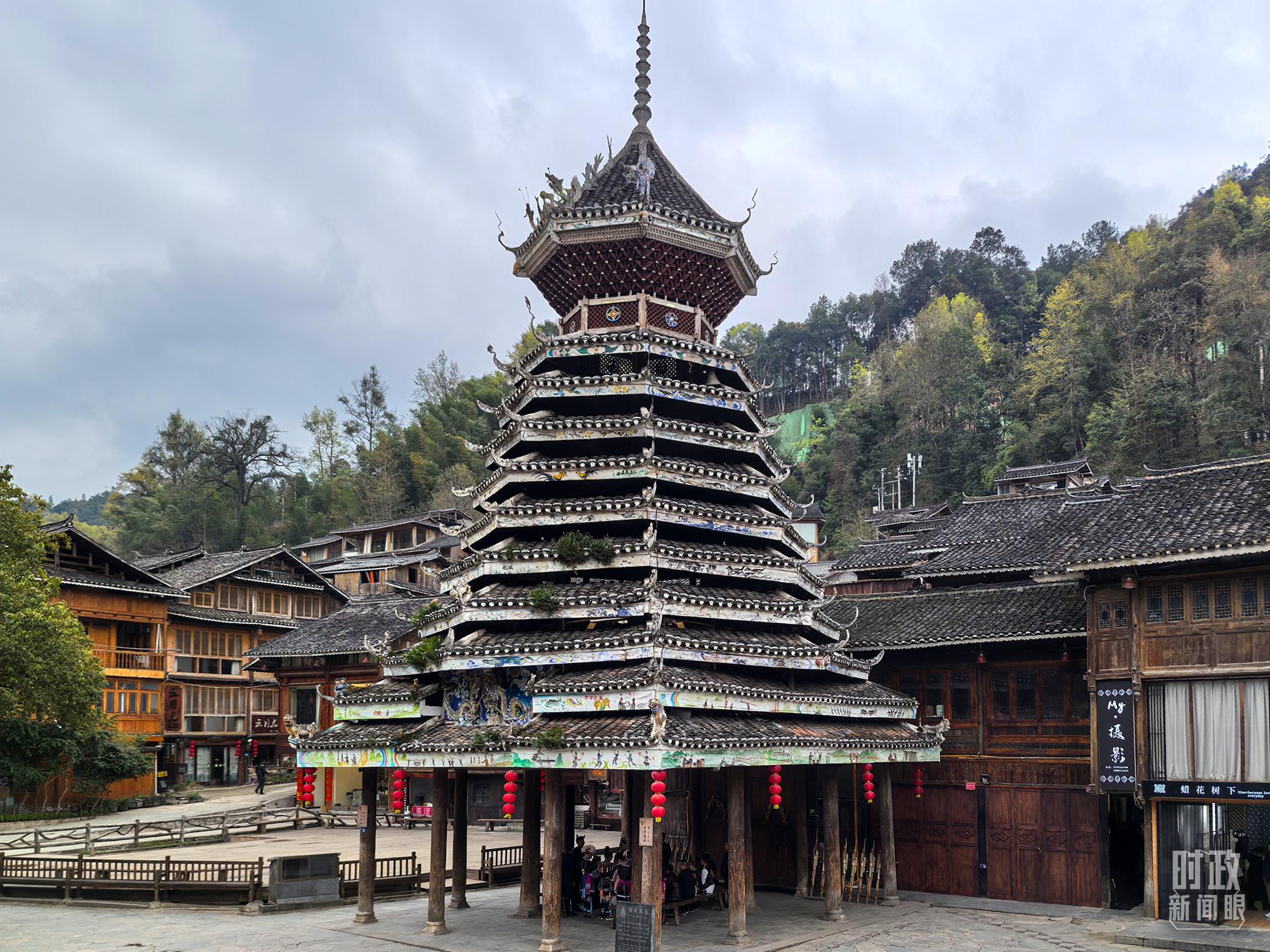 肇興侗寨以鼓樓群最為著名,五座鼓樓分別取名“仁團鼓樓”“義團鼓樓”“禮團鼓樓”“智團鼓樓”“信團鼓樓”。圖中為信團鼓樓。(總臺央視記者陸泓宇拍攝)