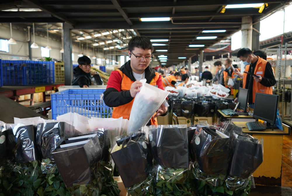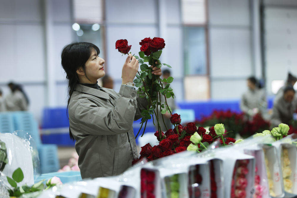 2022年11月11日,工作人員在昆明斗南花市給鮮花貼標(biāo)簽??爝f物流時效不斷優(yōu)化、冷鏈運輸技術(shù)持續(xù)提升,也為中國鮮花加速“出海”保駕護(hù)航。