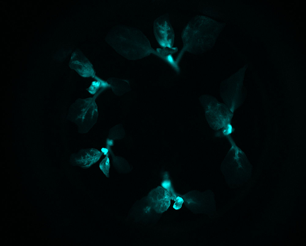 這是云南某農(nóng)業(yè)研發(fā)團(tuán)隊利用基因技術(shù)成功培育出肉眼可見的“自發(fā)光植物”在黑暗條件下發(fā)光(2017年6月21日攝)。