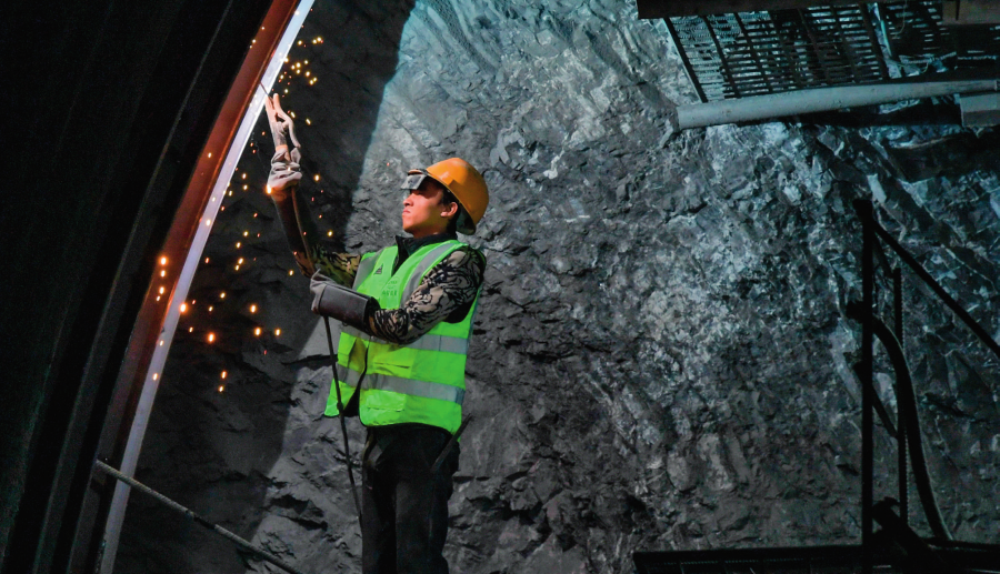 中鐵二十局的工人在西渝高鐵康渝段明燈山隧道內(nèi)施工(2025 年 1 月 15 日攝) 王曦?cái)z / 本刊