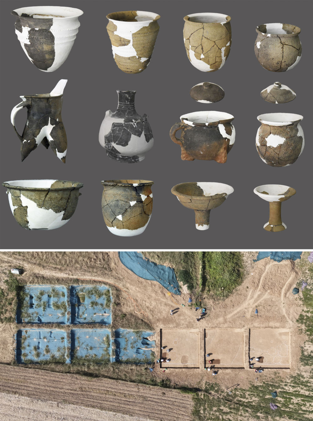 拼版照片:上圖為位于河南南陽方城縣的八里橋遺址出土的陶器(河南省文物考古研究院供圖);下圖為八里橋遺址發(fā)掘現(xiàn)場(chǎng)(無人機(jī)照片,新華社記者袁月明2024年9月11日攝)。八里橋遺址是豫南地區(qū)已發(fā)現(xiàn)規(guī)模最大、等級(jí)最高的二里頭文化聚落,為探索夏文化地方城邑聚落形態(tài)、社會(huì)結(jié)構(gòu)提供了新線索。