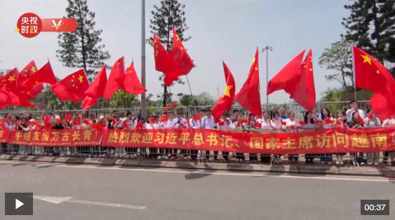 習(xí)近平乘車(chē)從機(jī)場(chǎng)赴下榻飯店途中,中越兩黨兩國(guó)旗幟迎風(fēng)飄揚(yáng),“中越友誼萬(wàn)古長(zhǎng)青”、“山水相連,命運(yùn)與共”、“中越情誼深,同志加兄弟”等紅色橫幅鮮艷奪目。當(dāng)?shù)孛癖姾椭匈Y機(jī)構(gòu)、留學(xué)生代表聚集在道路兩旁,熱烈歡迎習(xí)近平到訪(fǎng)。