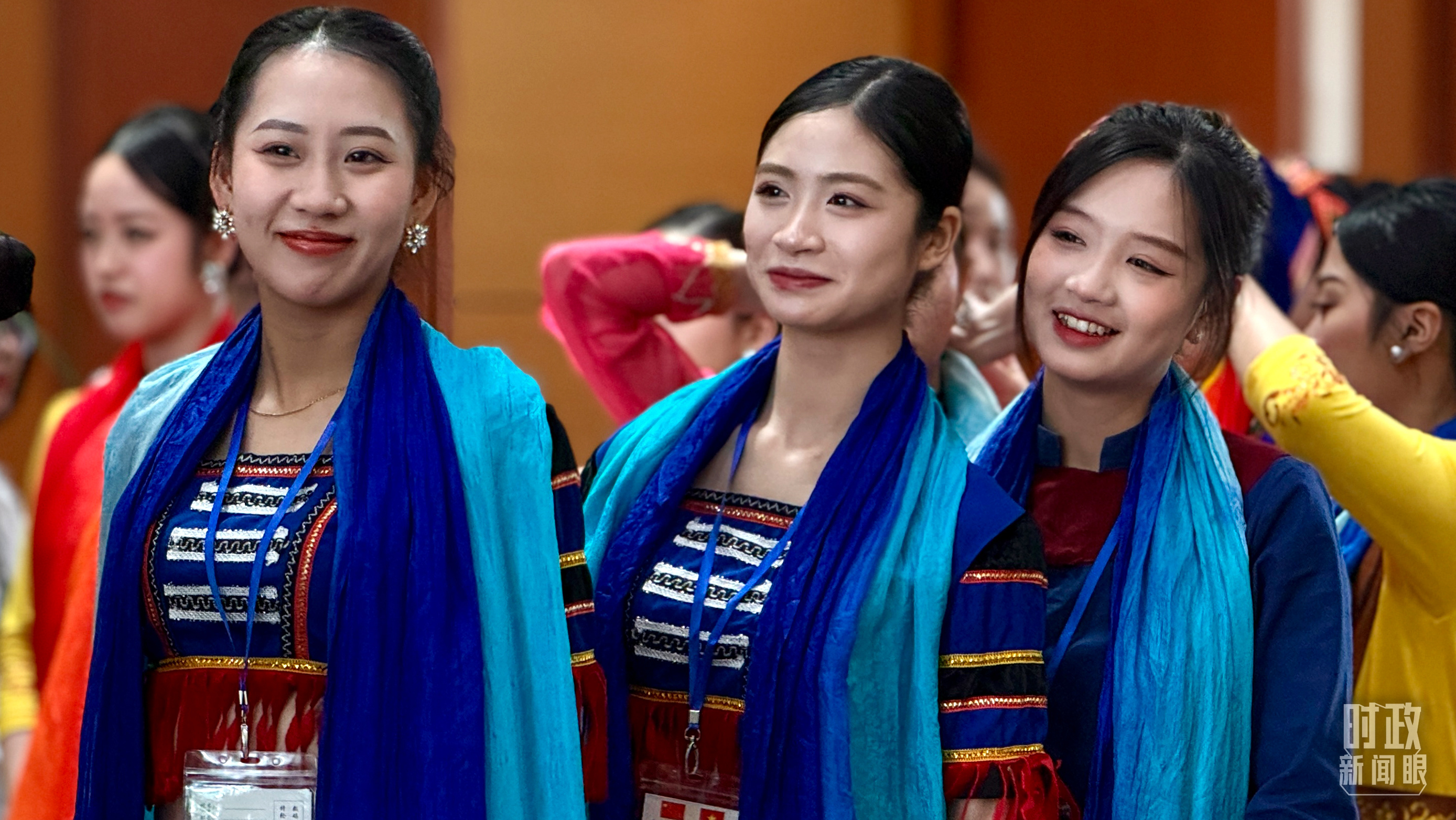當?shù)厍嗄晟碇褡宸b等待迎接習近平總書記。(總臺央視記者謝曉光拍攝)