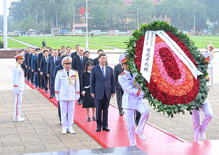 當?shù)貢r間2023年12月13日上午,中共中央總書記、國家主席習近平在河內瞻仰胡志明陵并敬獻花圈。 新華社記者 申宏 攝